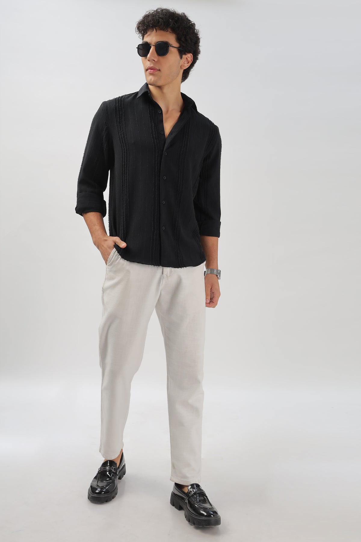 Elevate your wardrobe with the Black Textured Frayed Stripe Shirt, a modern take on classic elegance. This shirt features subtle frayed vertical stripes, adding depth and dimension to the sleek black fabric. Perfect for evening outings, casual gatherings, or making a stylish statement, this shirt is the epitome of understated sophistication.