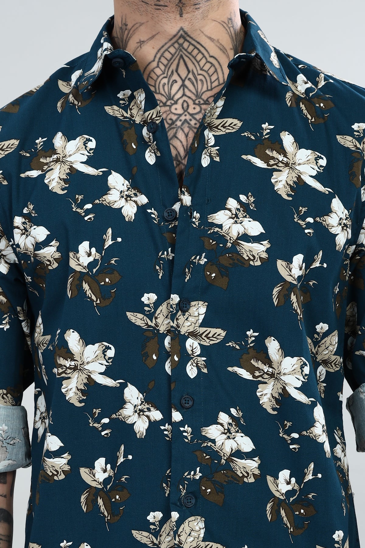 Make a bold statement with this Navy Floral Printed Shirt. Featuring a vibrant floral design on a deep navy base, this shirt combines classic elegance with a modern edge. Crafted from lightweight and breathable fabric, it ensures all-day comfort while keeping you stylish. The roll-up sleeve option adds versatility to your look, making it perfect for both casual outings and semi-formal gatherings.